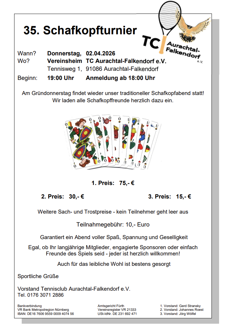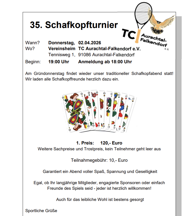 Der Tennisclub Aurachtal-Falkendorf e.V. lädt alle Schafkopffreunde wieder zum traditionellen Schafkopfabend ein!