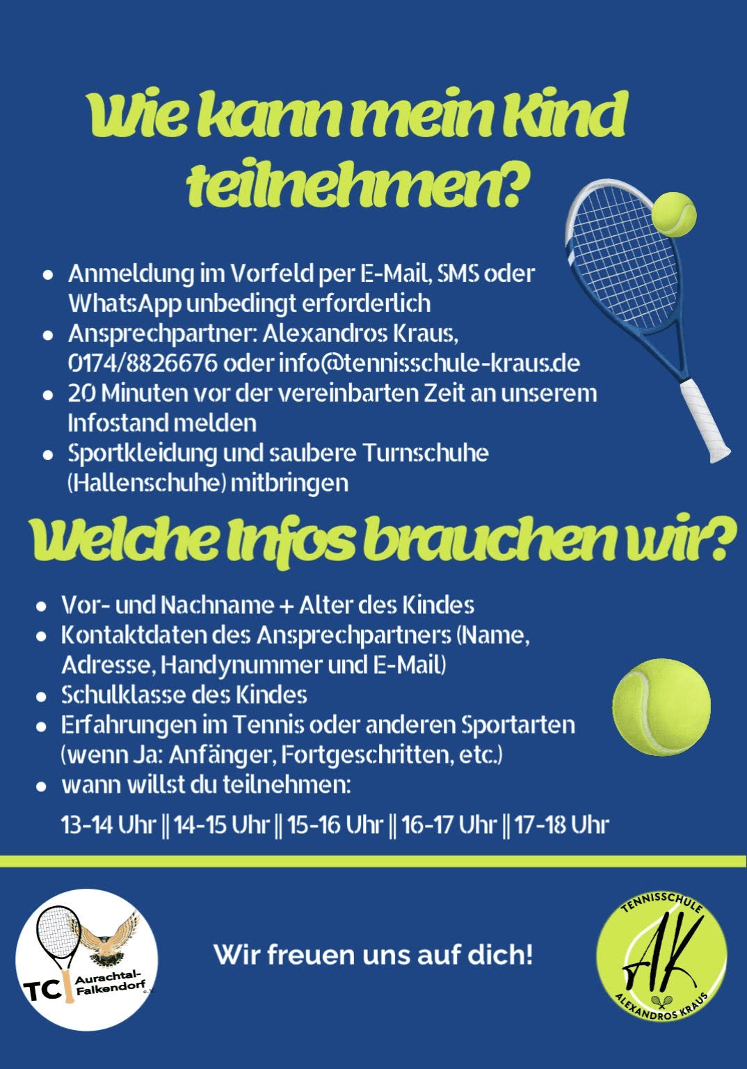 Liebe Tennisfreunde und alle die es noch werden möchten, wir laden Euch herzlich zu unserem Tag der offenen Tür auf unserer Tennisanlage ein. Kommt vorbei, bringt Eure Familie und Freunde mit, und erlebt einen sportlichen Tag voller Tennis und guter Laune.
